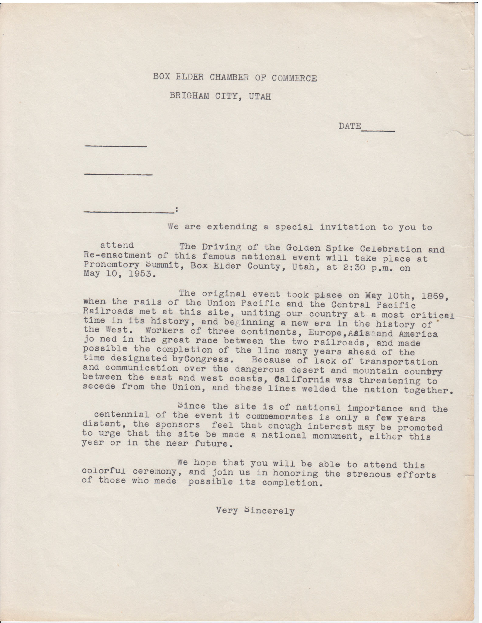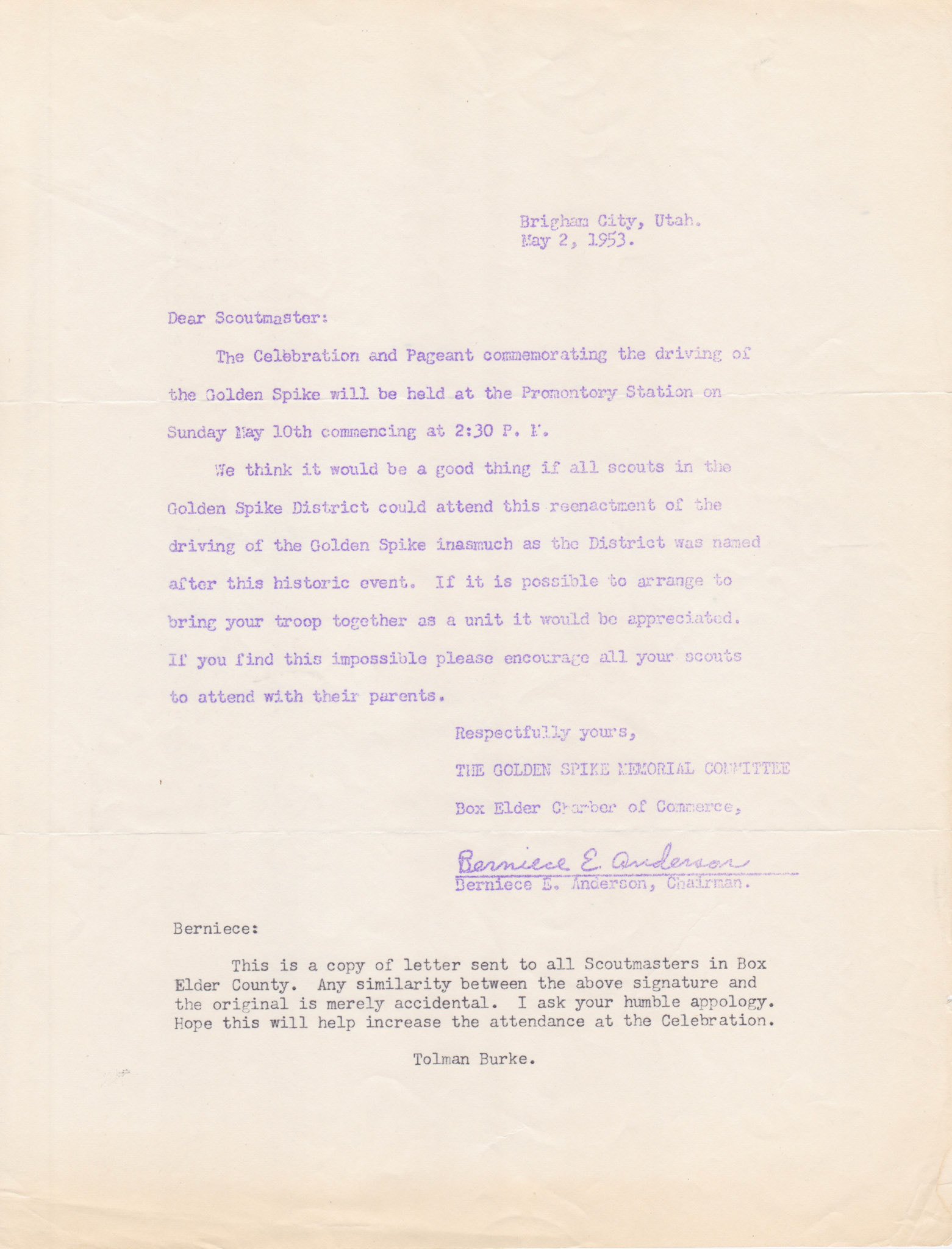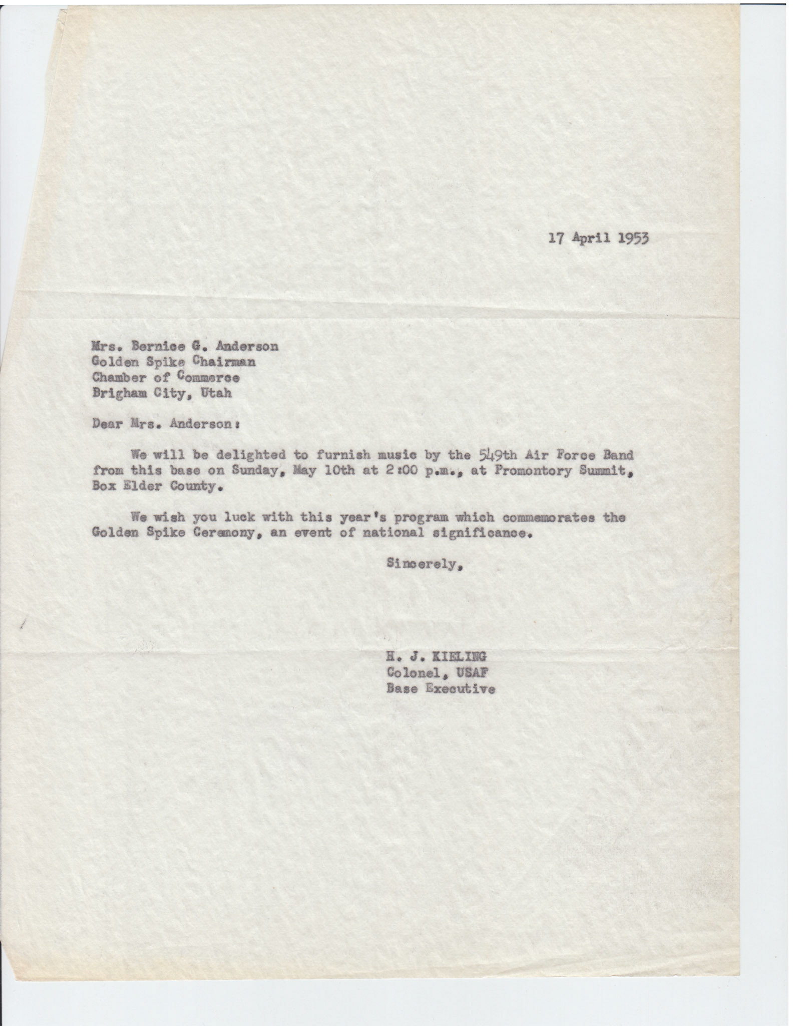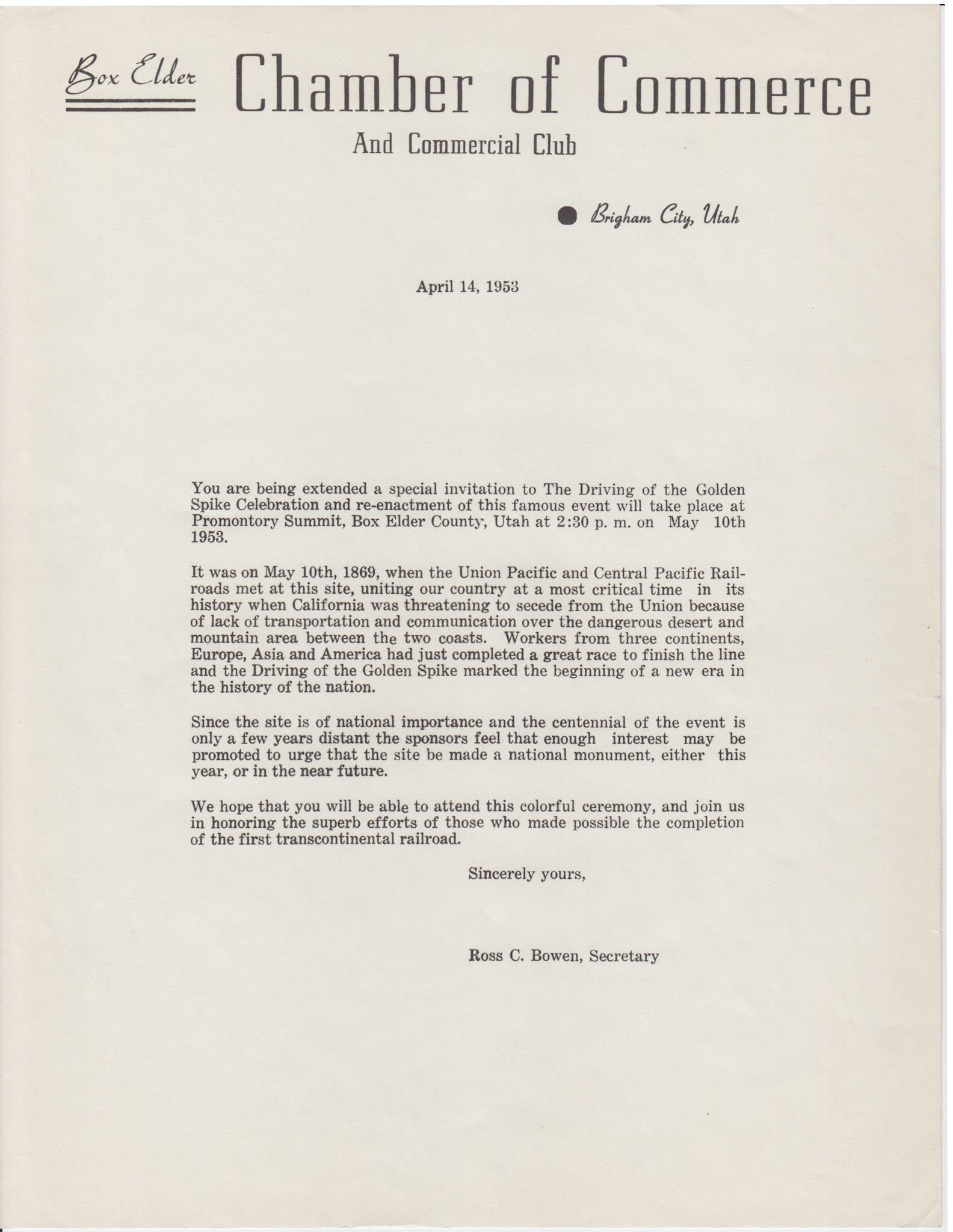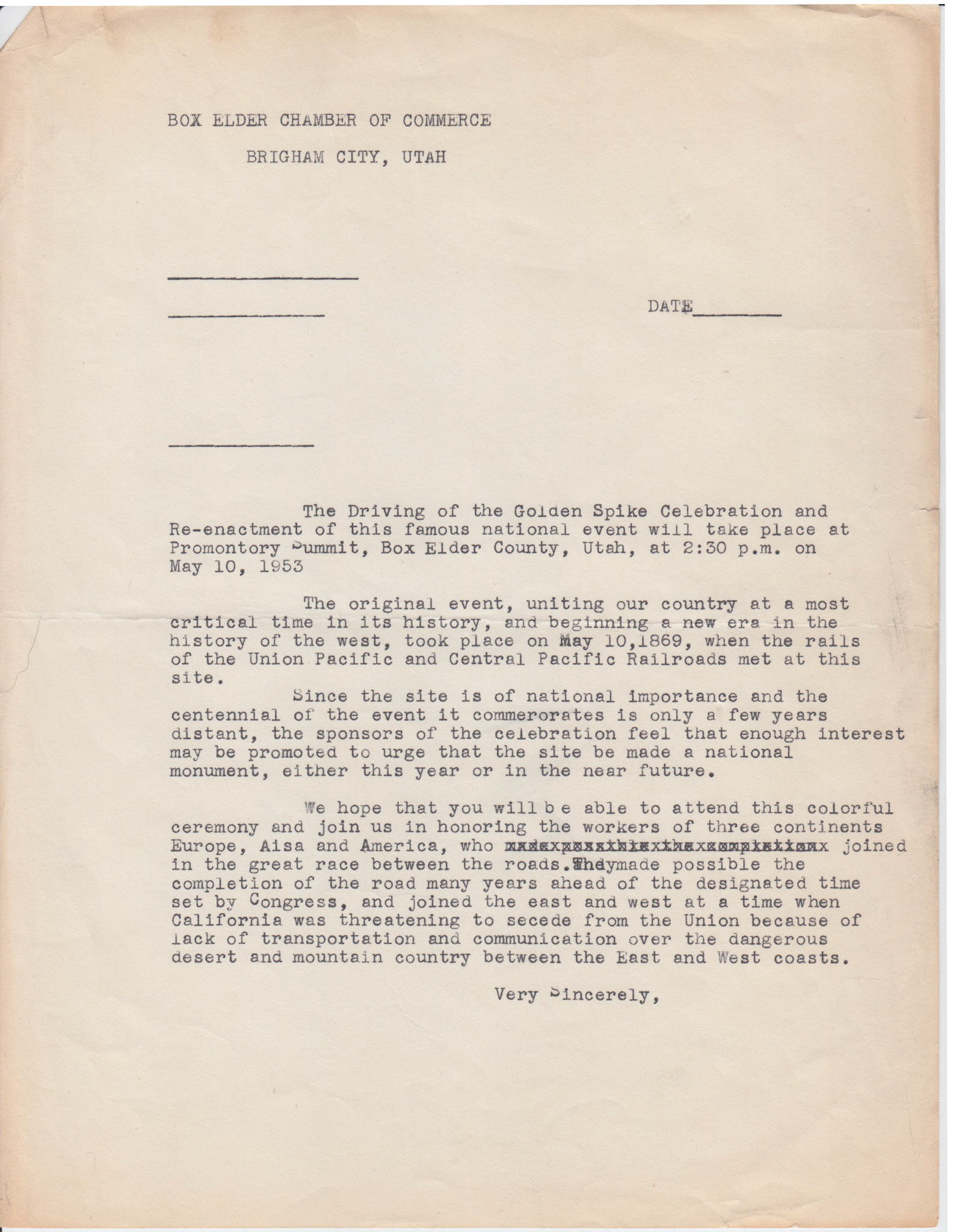 Ogden Golden Spike Celebration Committee letter, 1952. Bernice Gibbs Anderson Collection. NPS