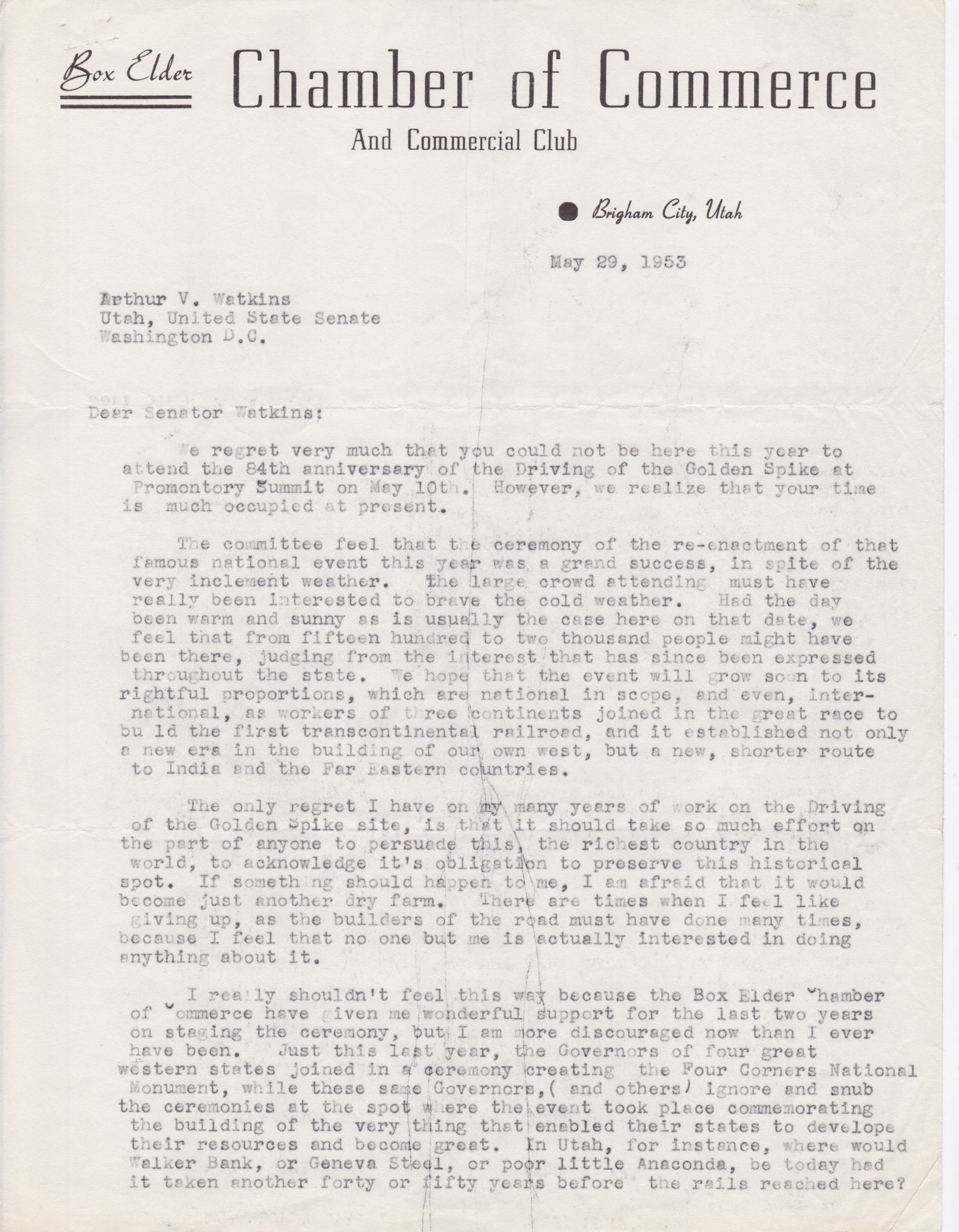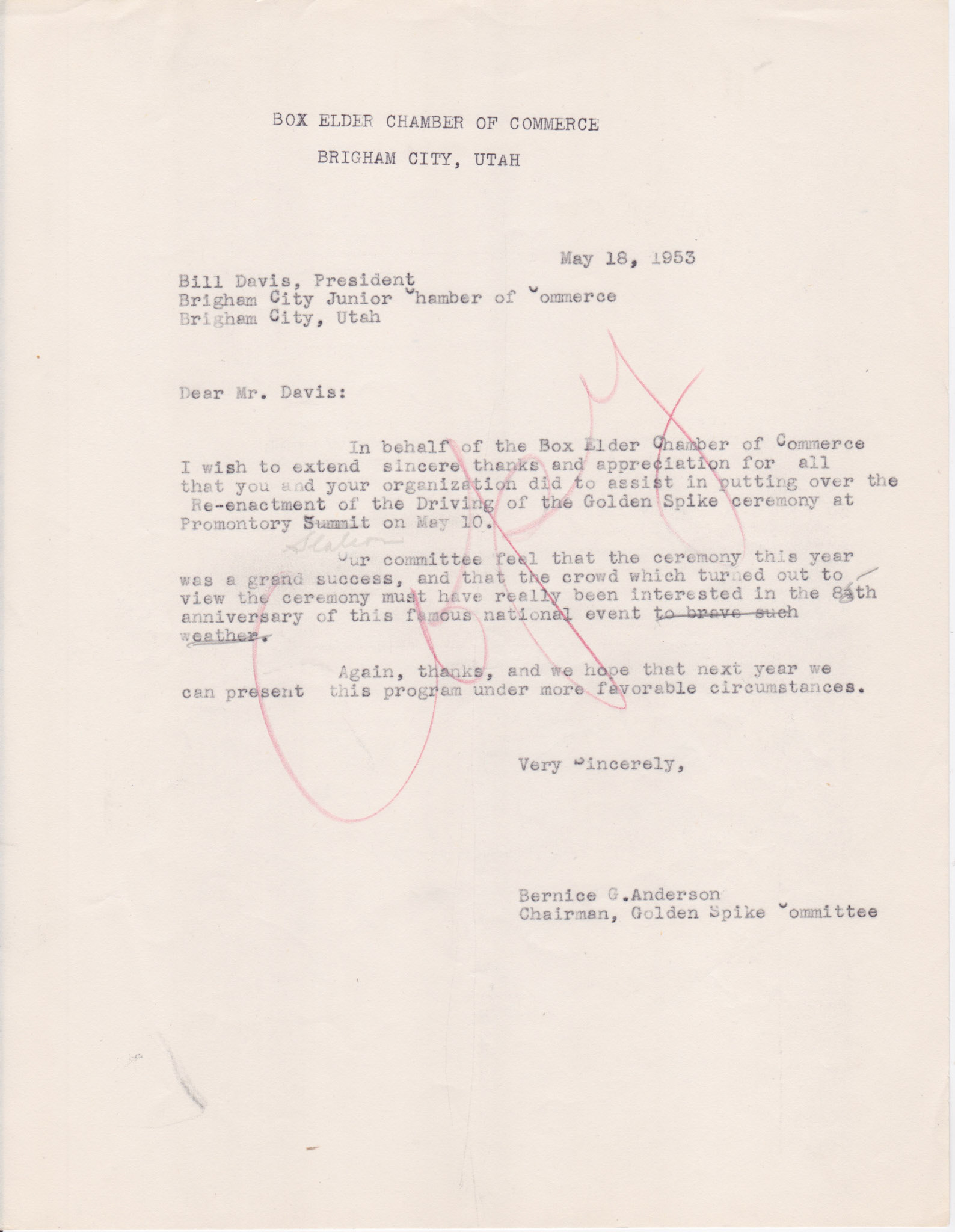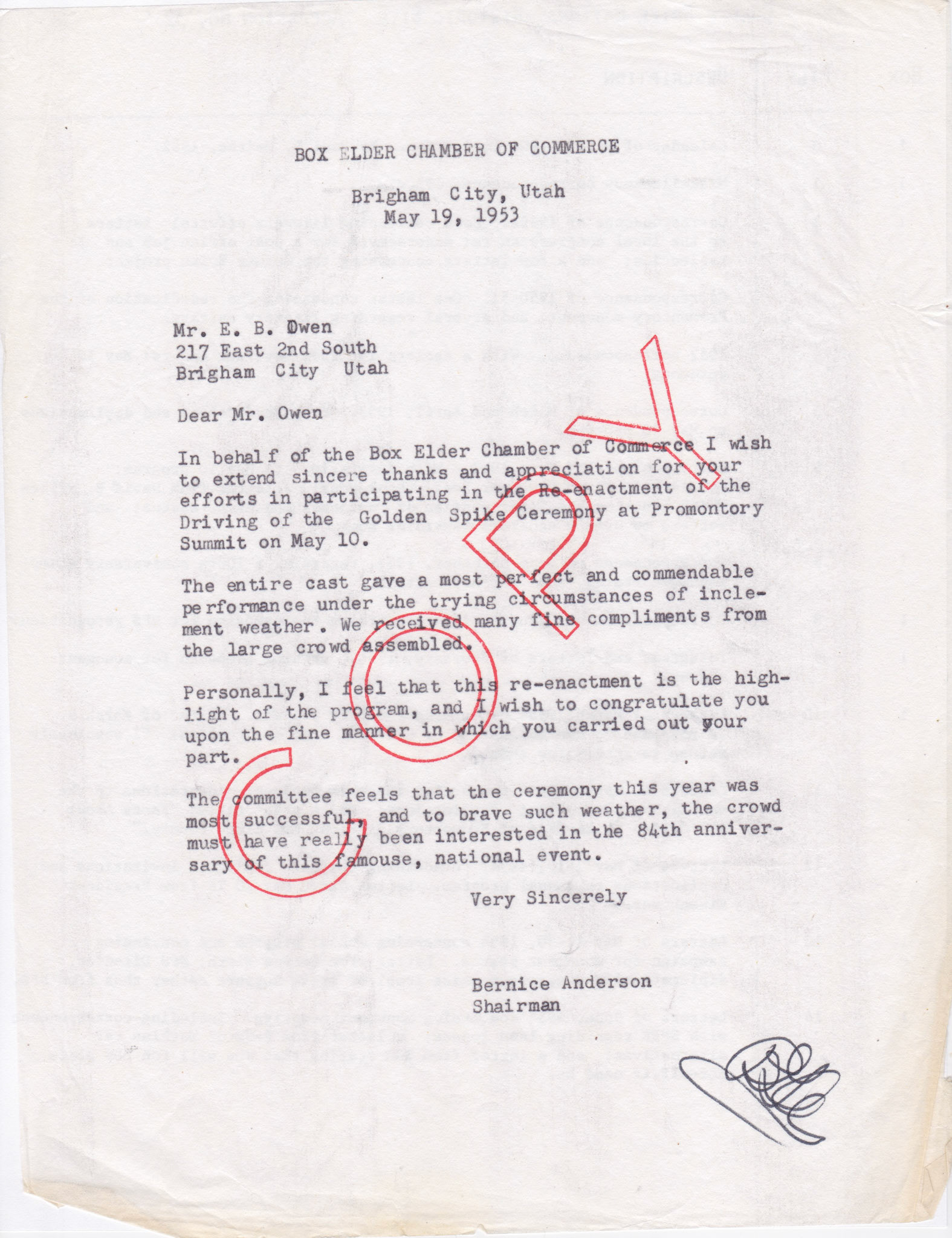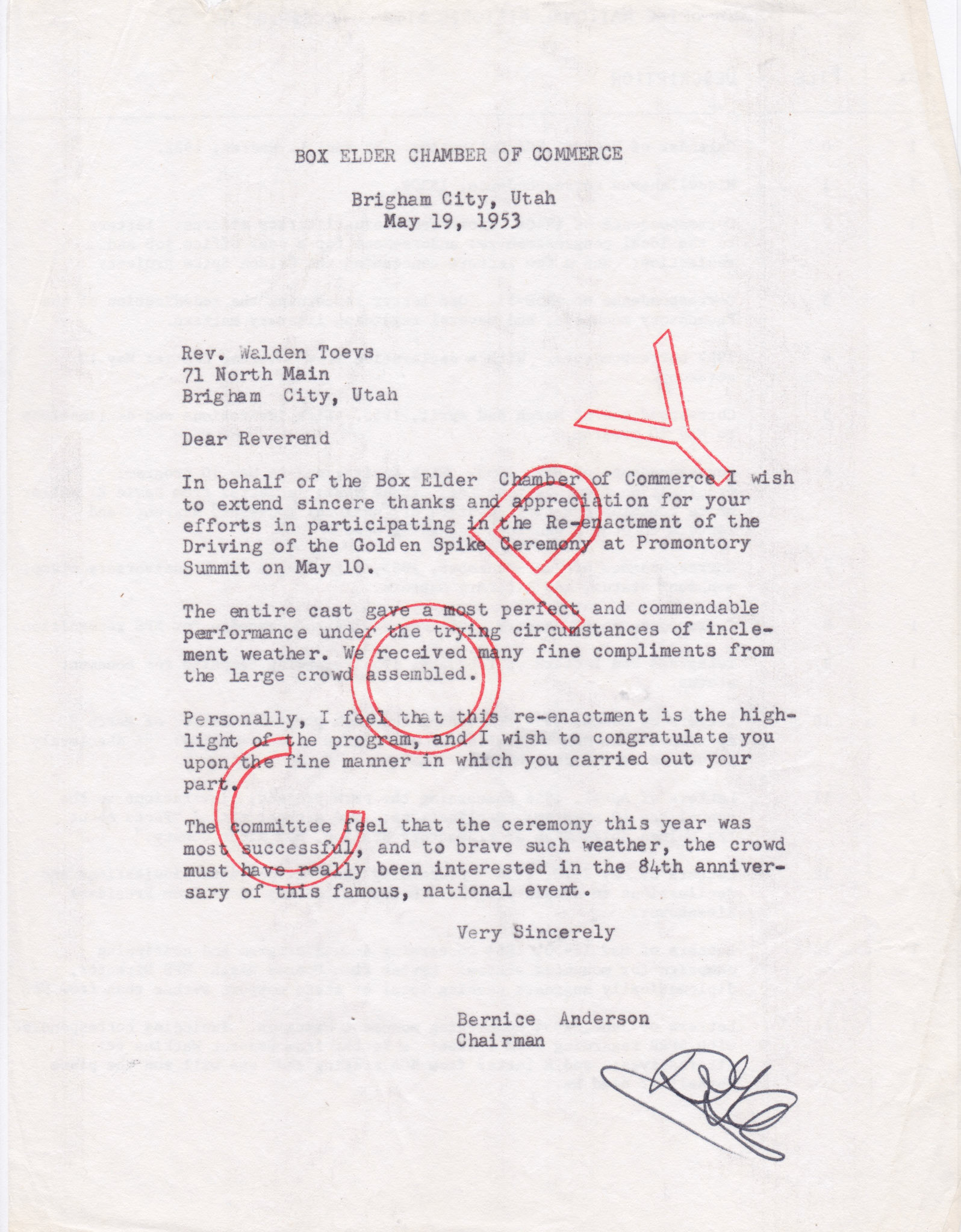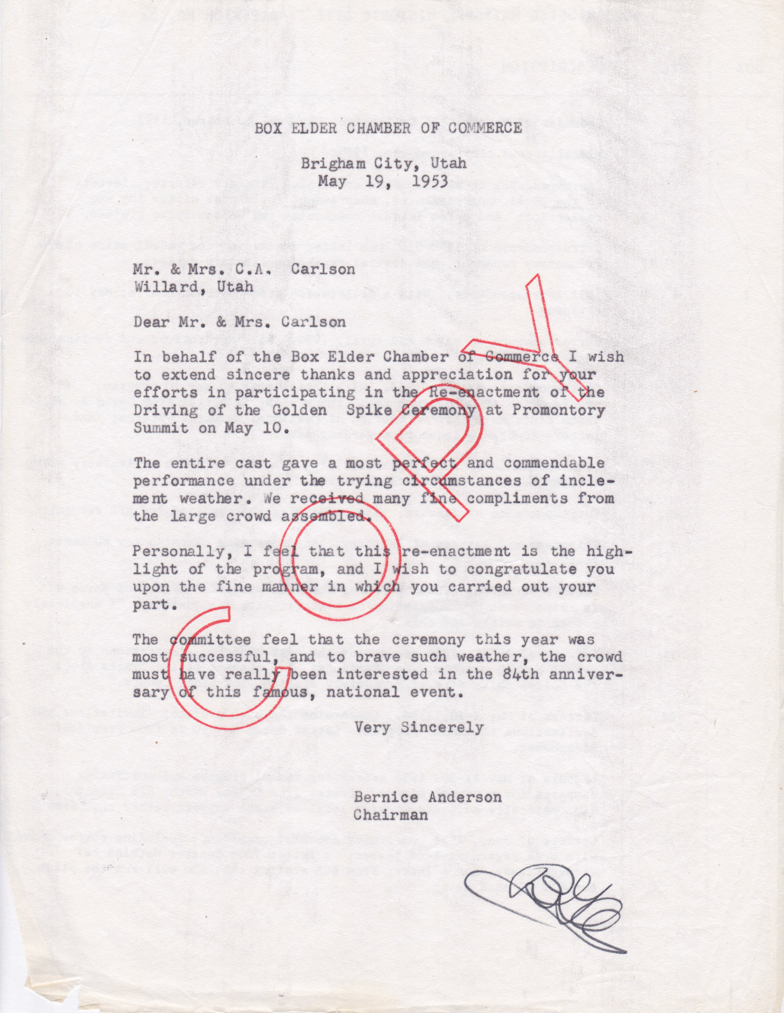 Ogden Golden Spike Celebration Committee letter, 1952. Bernice Gibbs Anderson Collection. NPS