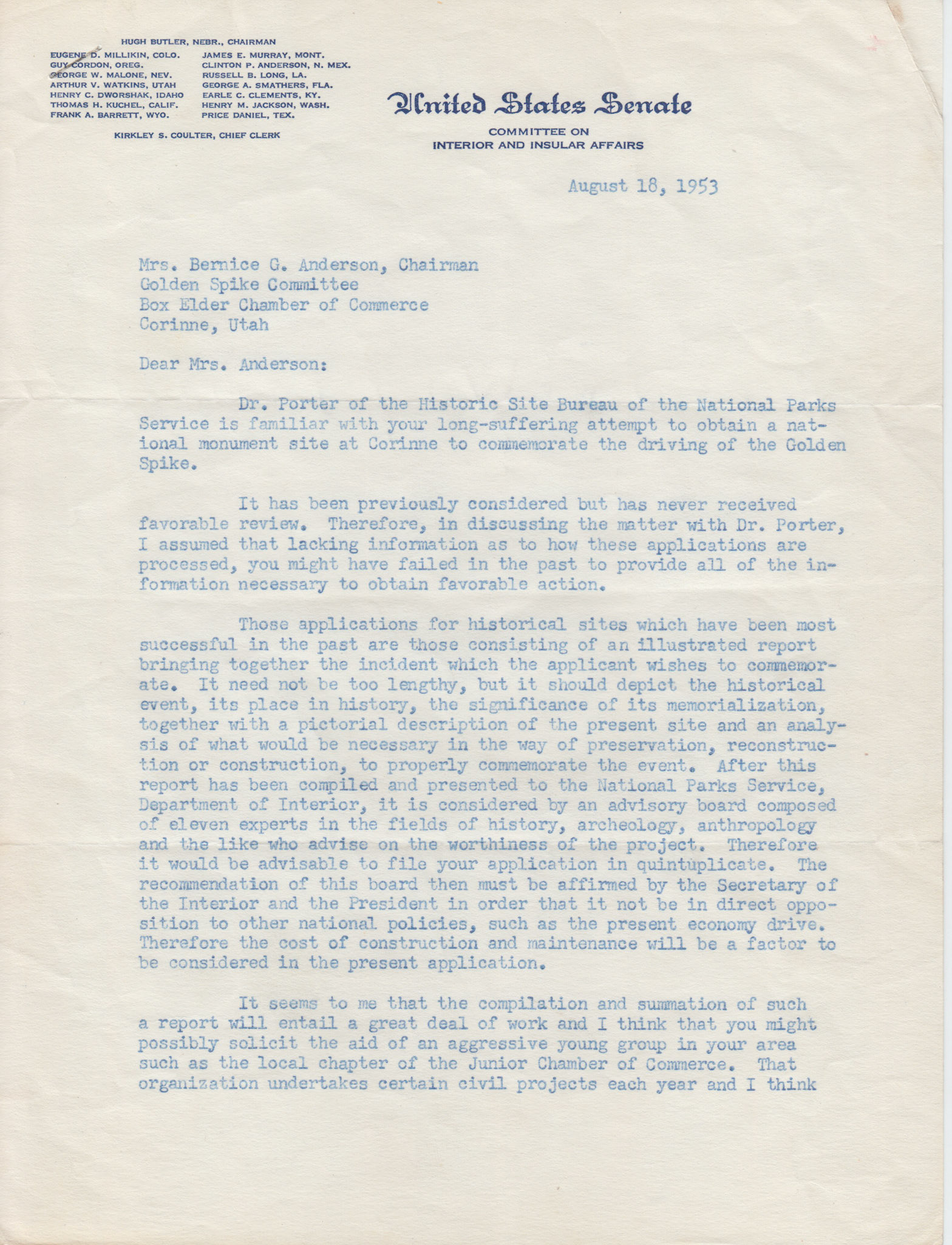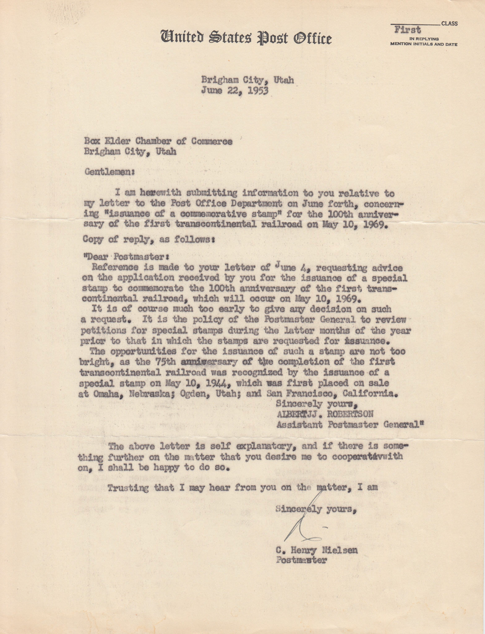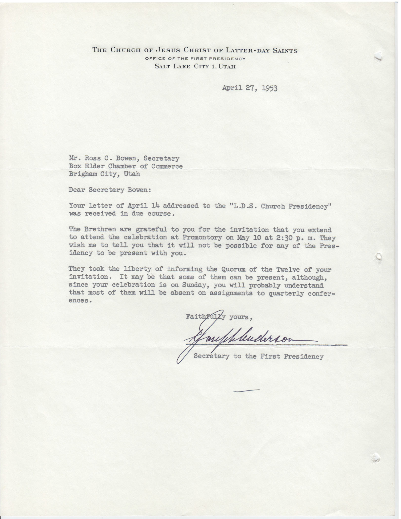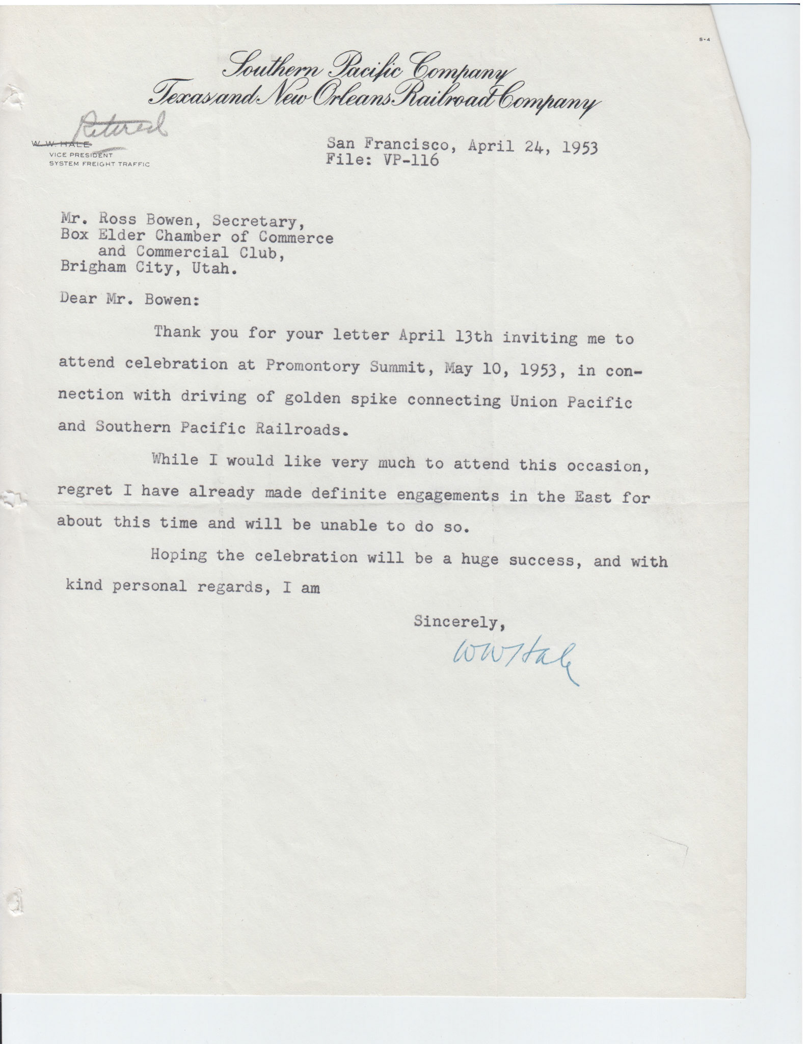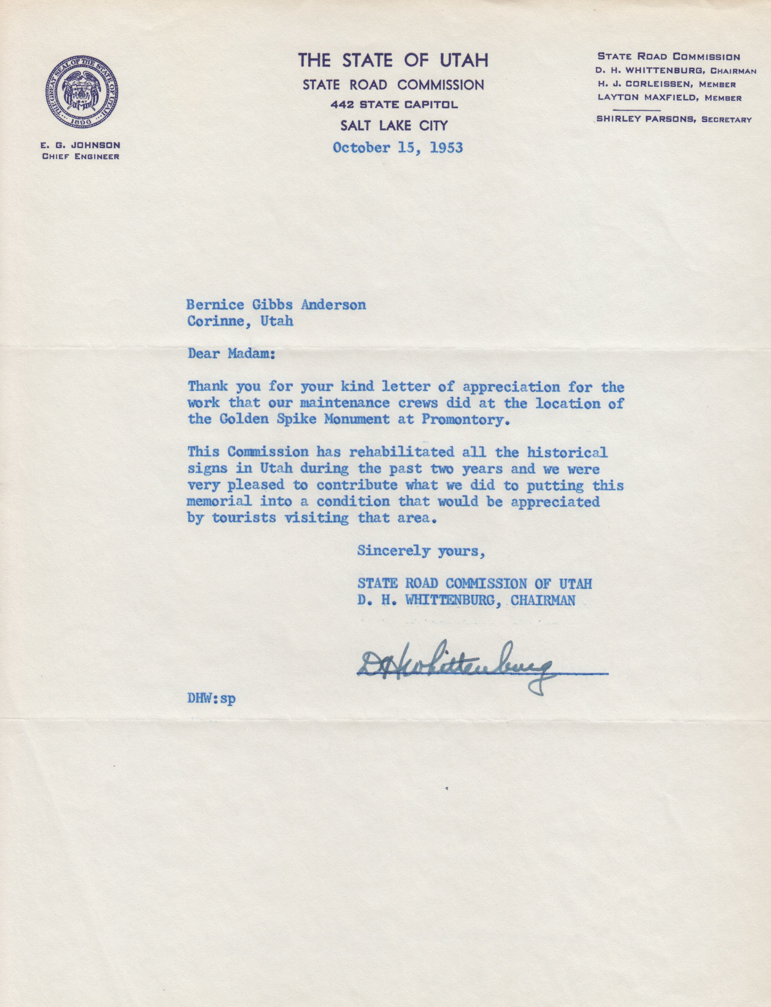 Ogden Golden Spike Celebration Committee letter, 1952. Bernice Gibbs Anderson Collection. NPS