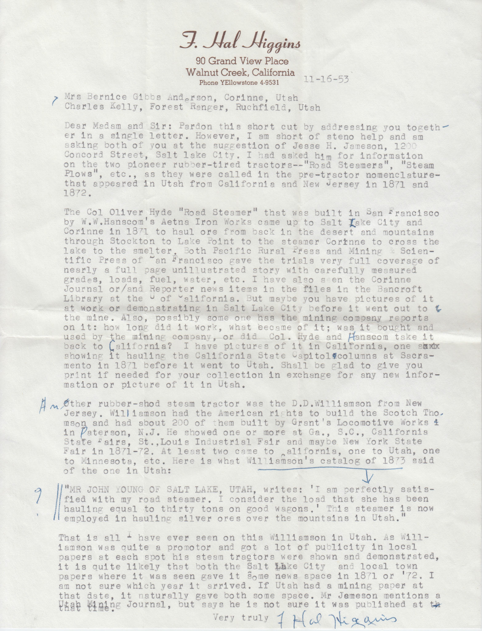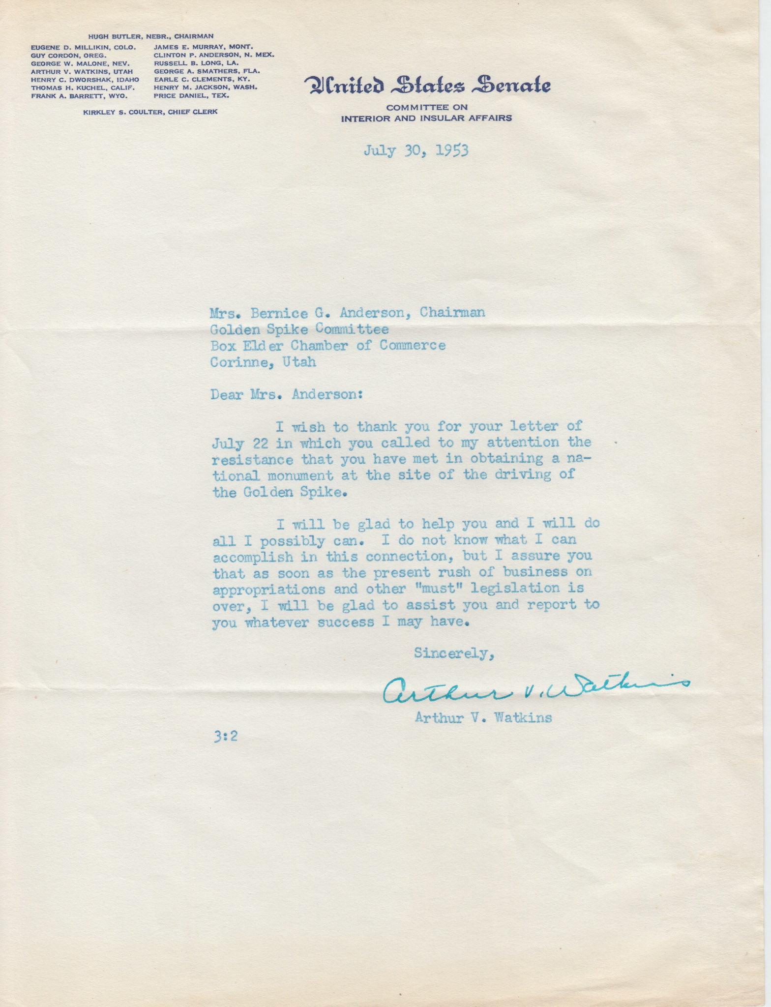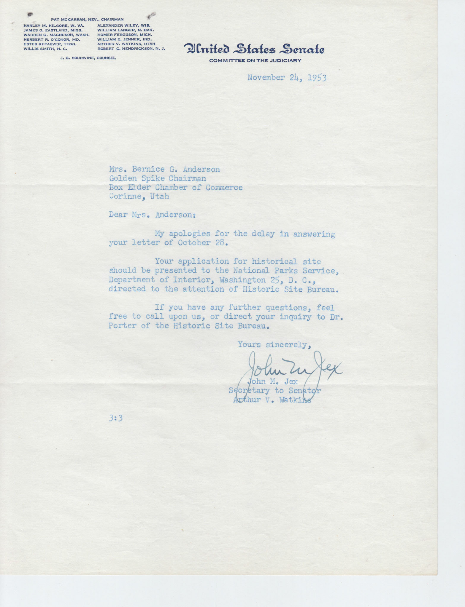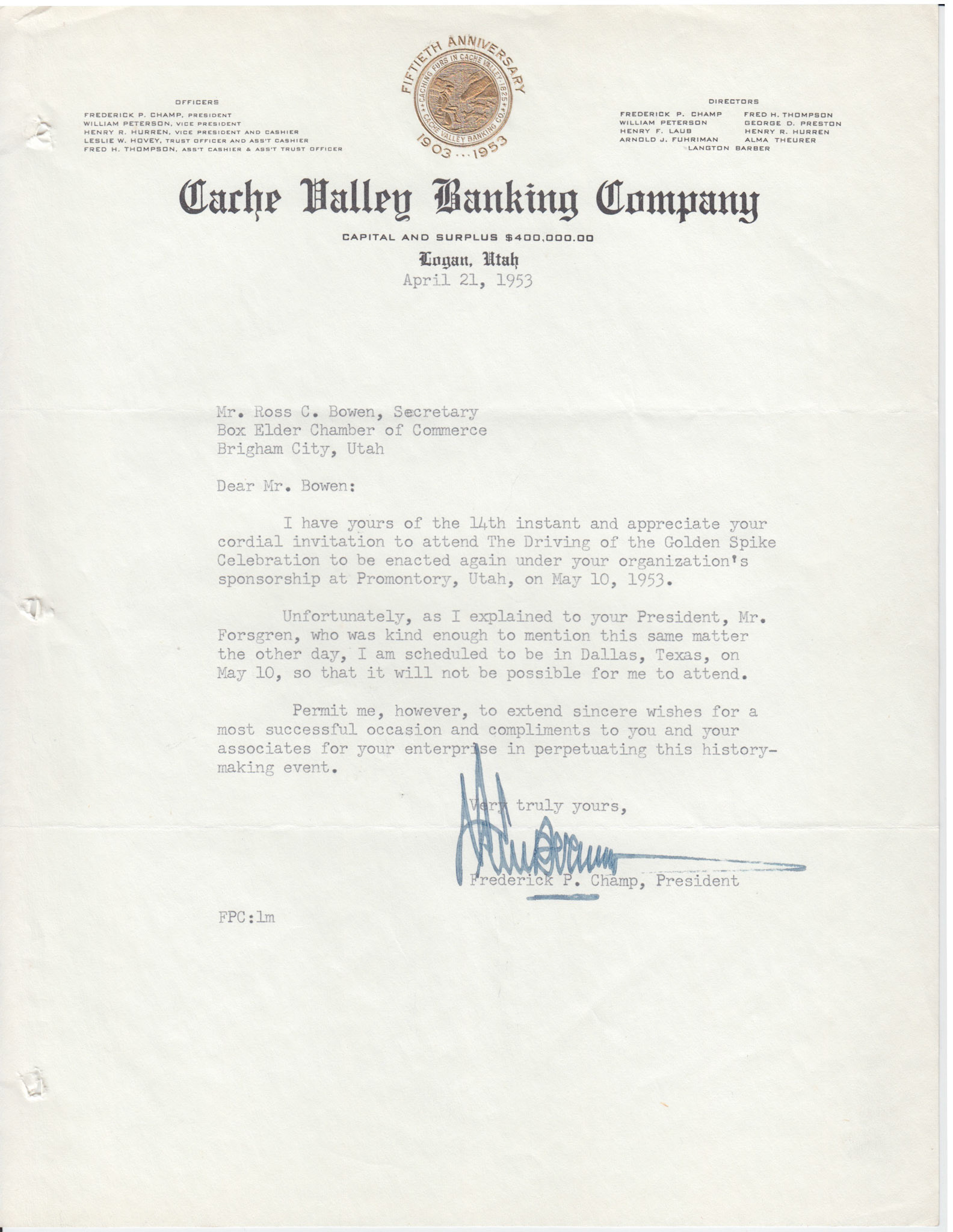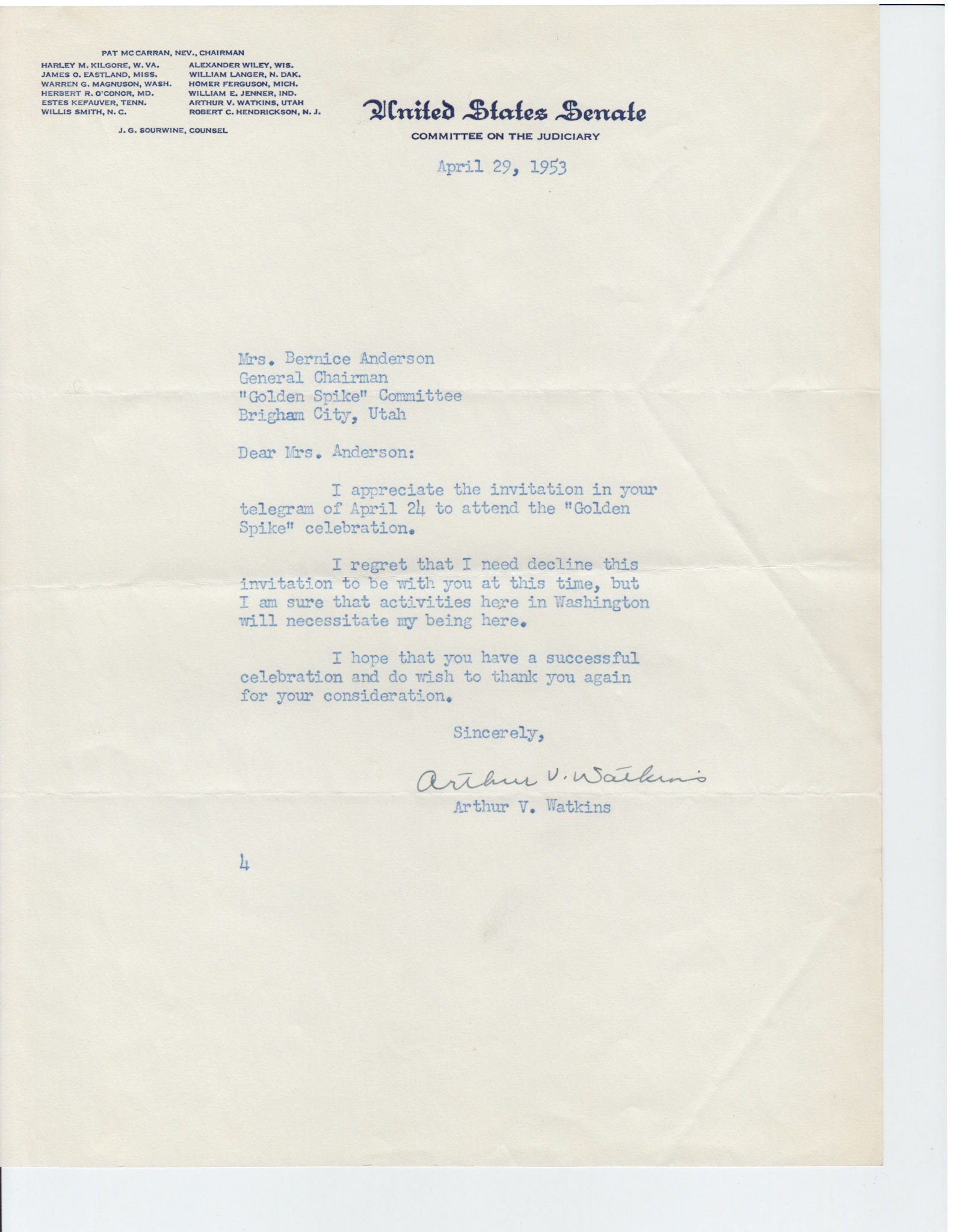Ogden Golden Spike Celebration Committee letter, 1952. Bernice Gibbs Anderson Collection. NPS