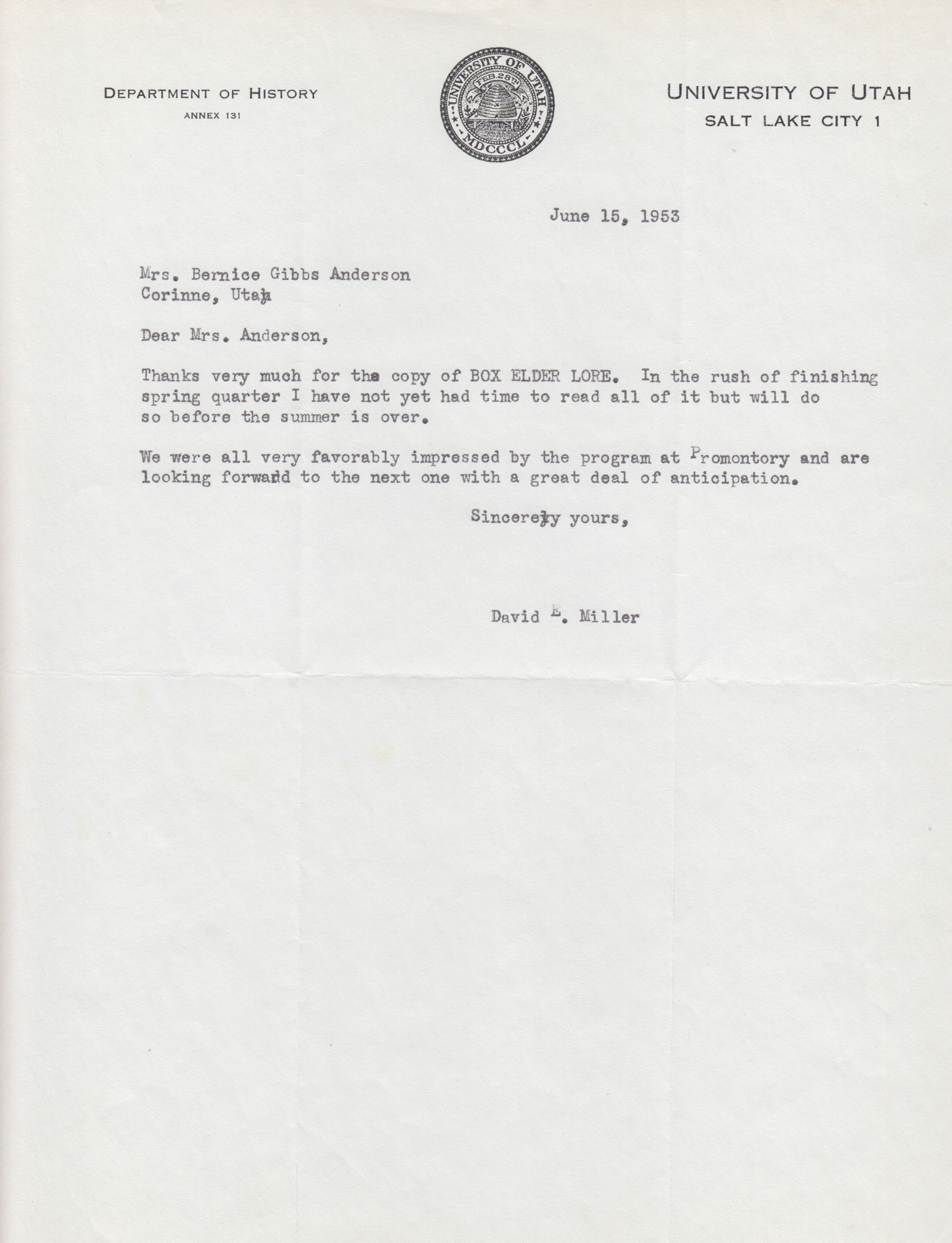Thank you to Box Elder High School Principal, 1952 Bernice Gibbs Anderson Collection, NPS