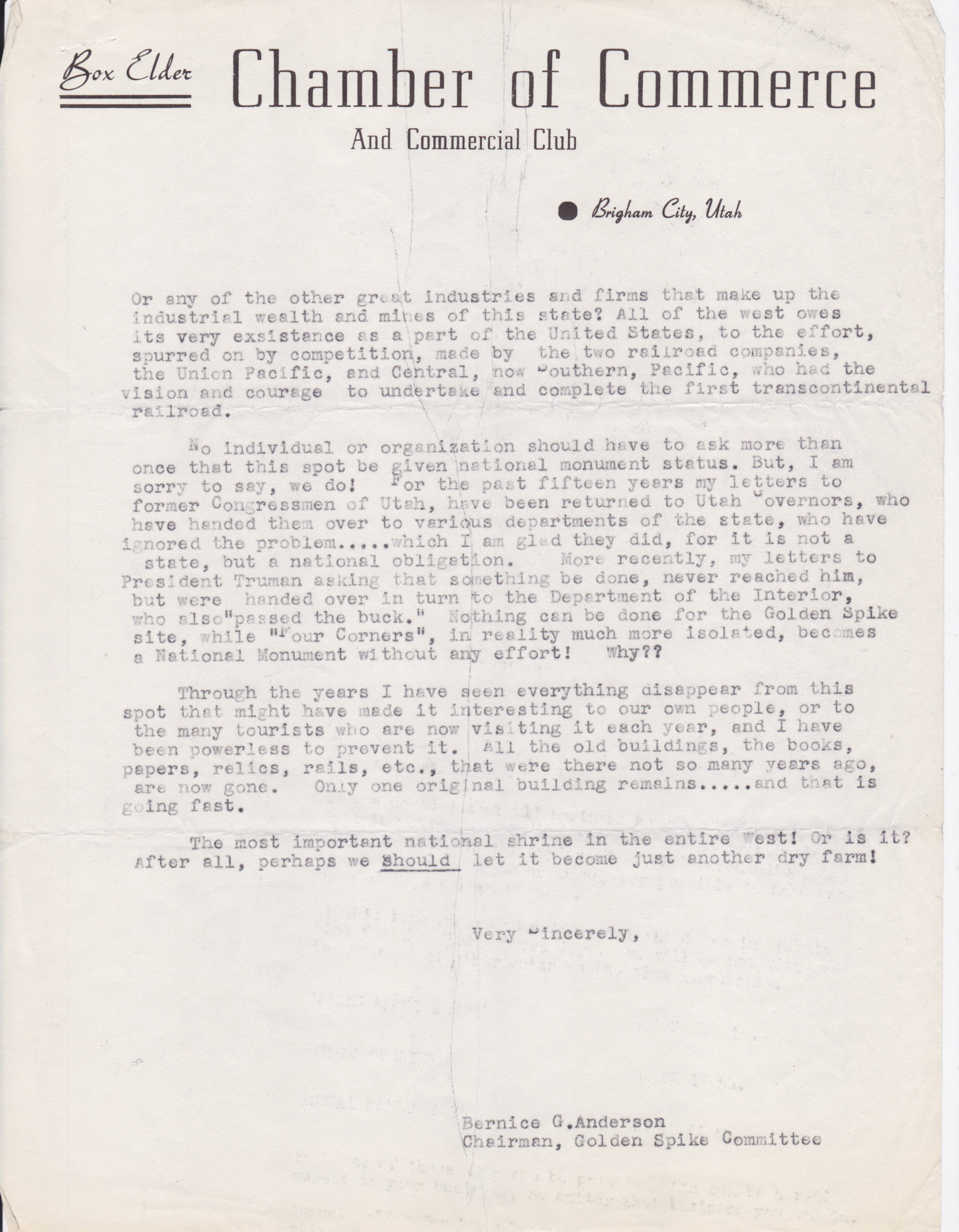 SLC Chamber of Commerce suggestions for Golden Spike site, 1952. Bernice Gibbs Anderson Collection, NPS